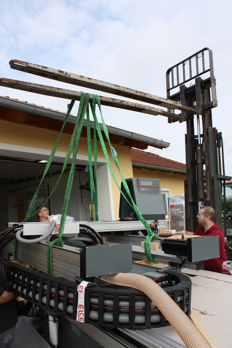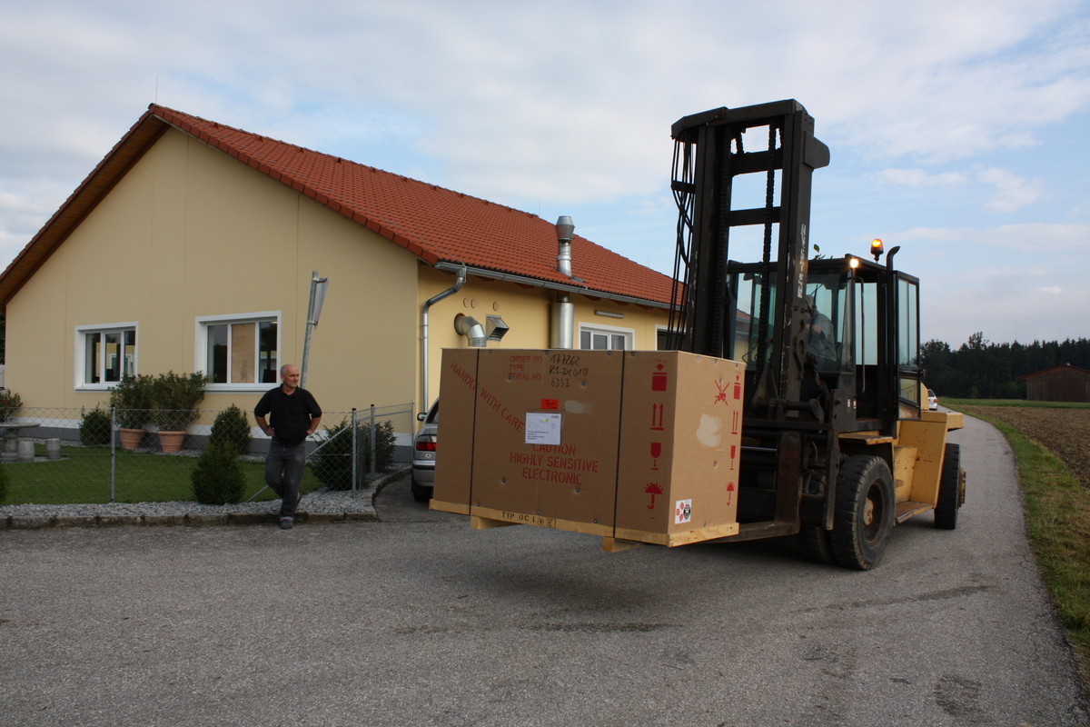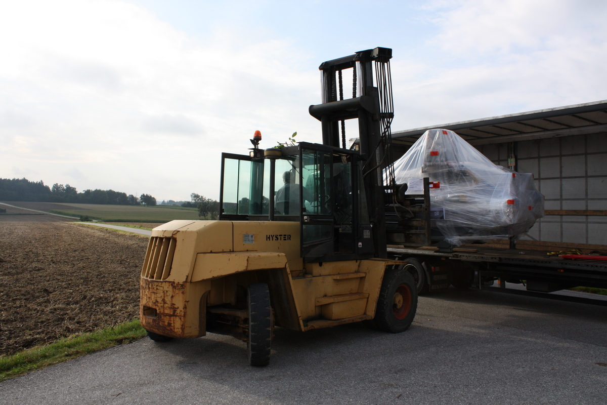 Natürlich gab es einige Hürden beim Abladen und installieren der Anlage selbst zu überwinden. Diese konnten jedoch schlussendlich auch alle gelöst werden. Nur als kurzfristig der Laser am Seil des Staplers hing (um die Laser-Kanone 90° zu drehen), taten dies die Nerven des Firmenchefs ebenfalls… Aber keine Sorge – die Drehung (und auch der Rest) gingen gut aus!