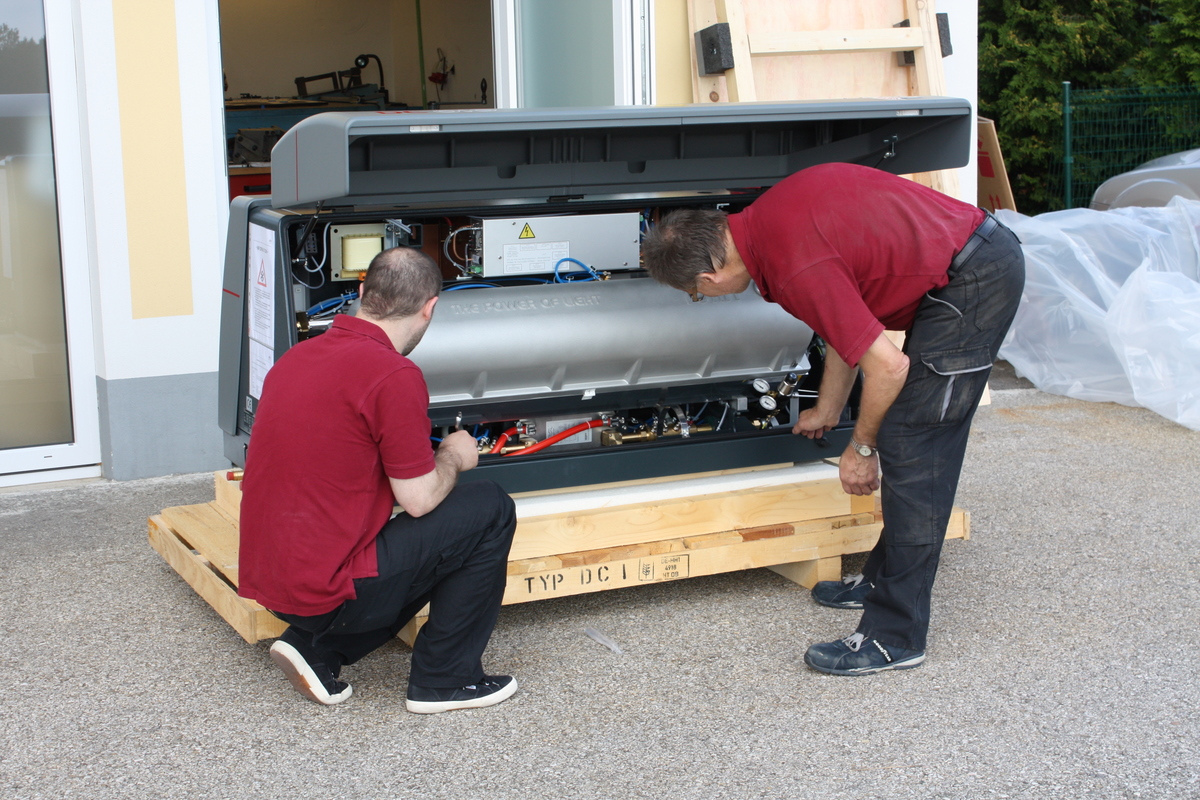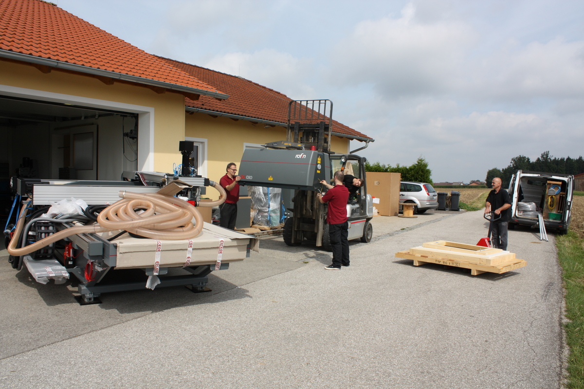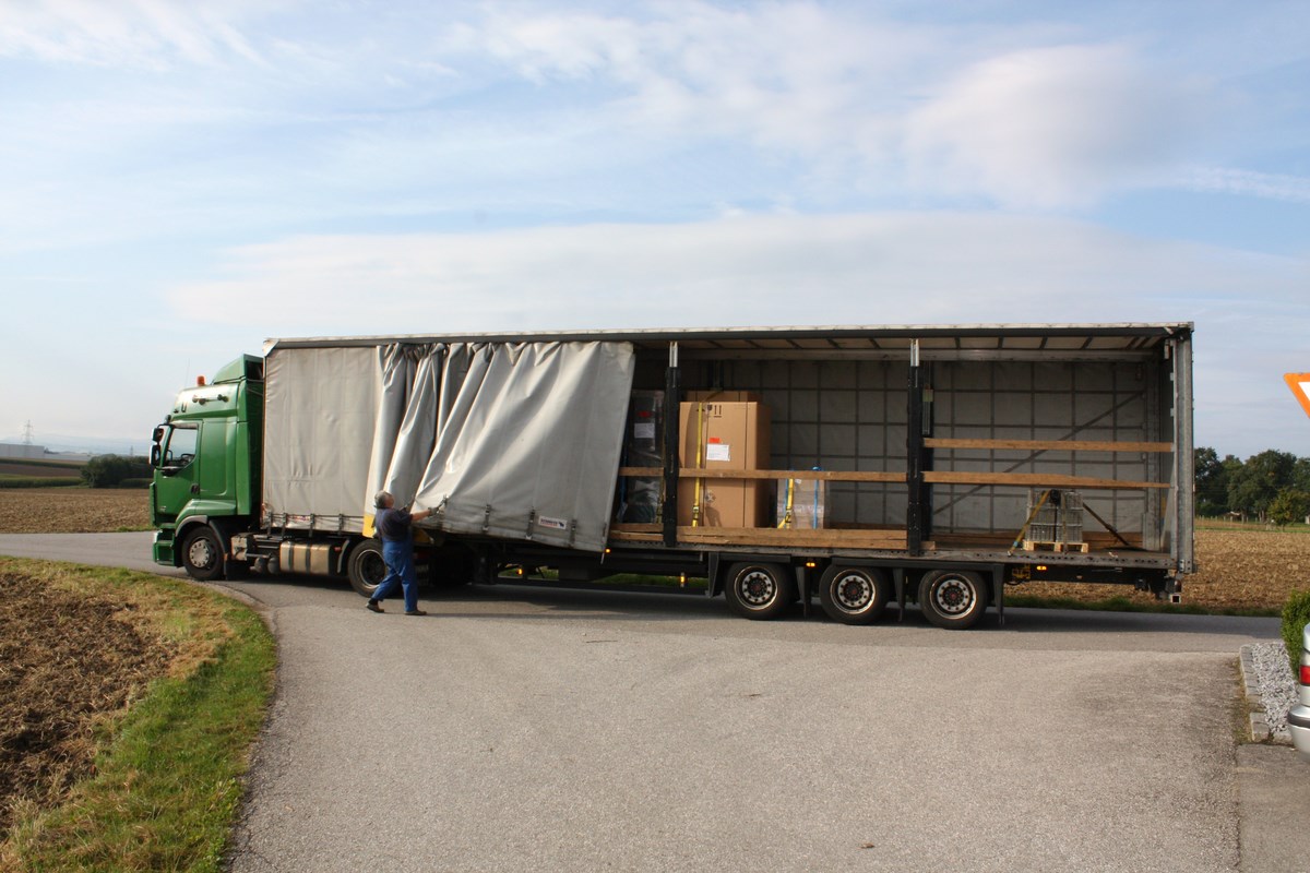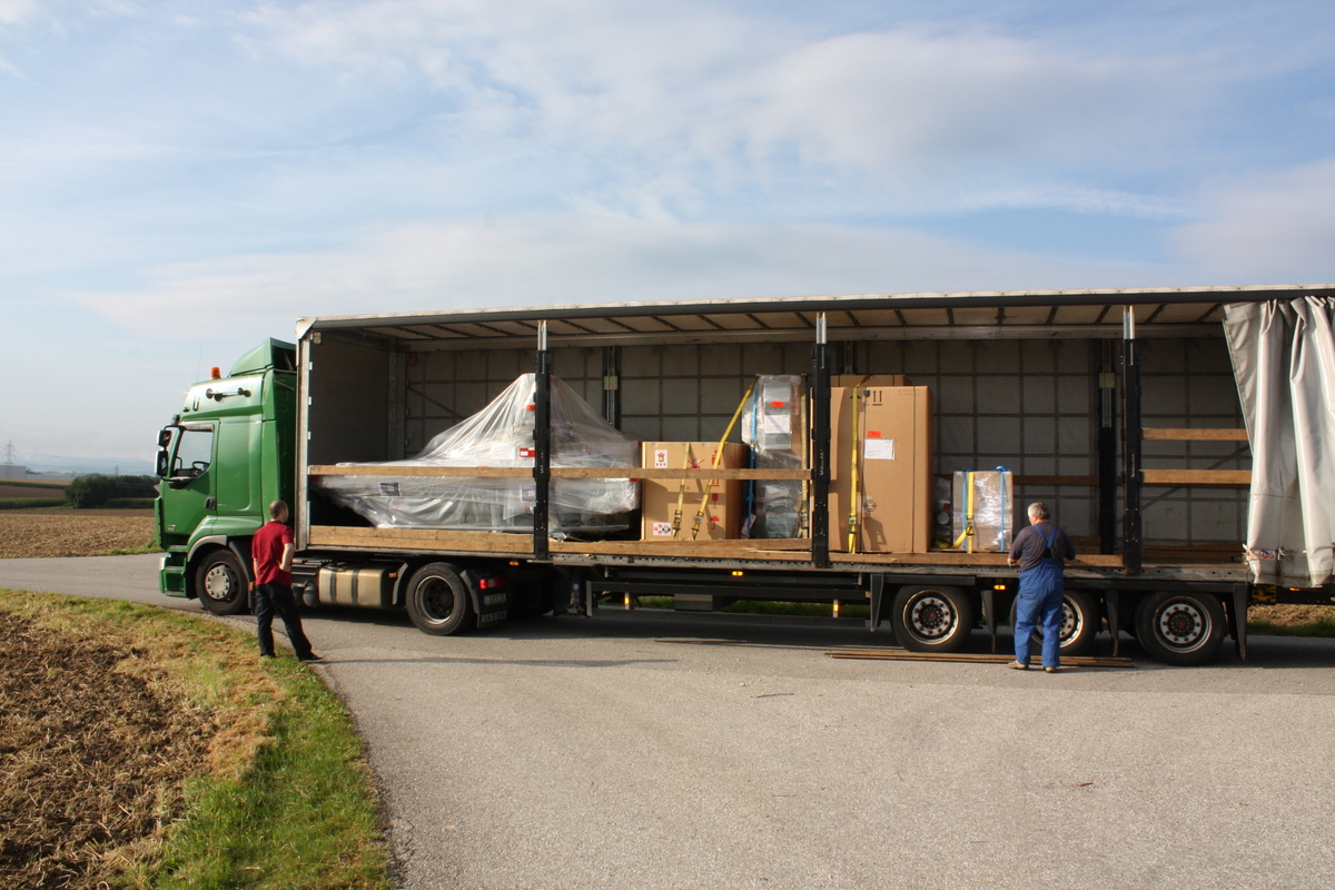 Natürlich gab es einige Hürden beim Abladen und installieren der Anlage selbst zu überwinden. Diese konnten jedoch schlussendlich auch alle gelöst werden. Nur als kurzfristig der Laser am Seil des Staplers hing (um die Laser-Kanone 90° zu drehen), taten dies die Nerven des Firmenchefs ebenfalls… Aber keine Sorge – die Drehung (und auch der Rest) gingen gut aus!