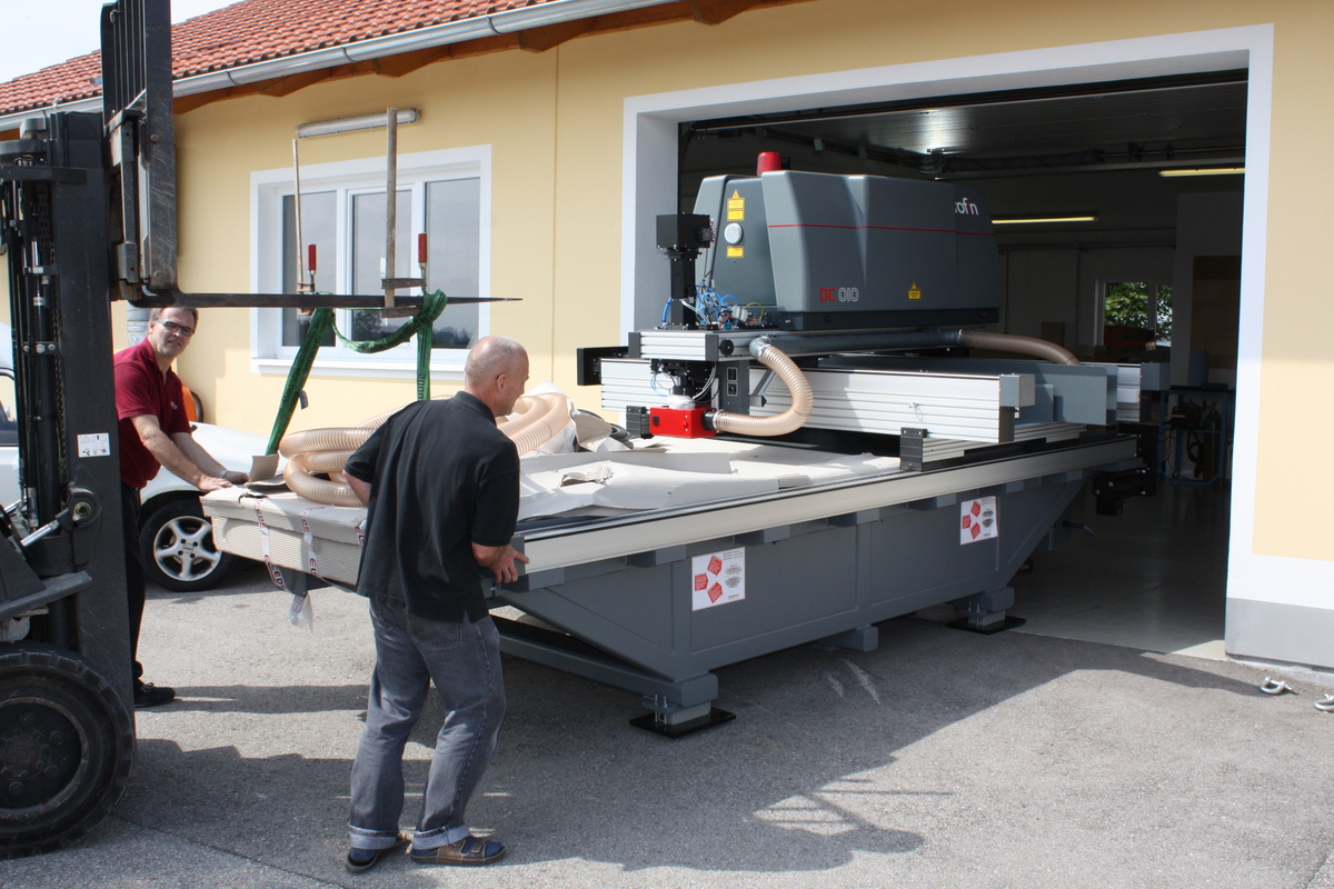 Heute Morgen war es endlich soweit! Die 1000-Watt Laser-Schneidanlage der Firma Elcede wurde angeliefert. Pünktlich kam das 4 Tonnen „Päckchen“ aus Deutschland an und die Spannung stieg enorm. Für einen Betrieb wie Kritzinger Stanzformenbau ist eine Anlage in dieser Dimension nichts Alltägliches.